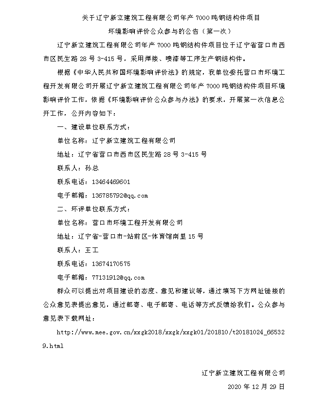 關(guān)于遼寧新立建筑工程有限公司年產(chǎn)7000噸鋼結(jié)構(gòu)件項(xiàng)目環(huán)境影響評價公眾參與的公告(第一次)