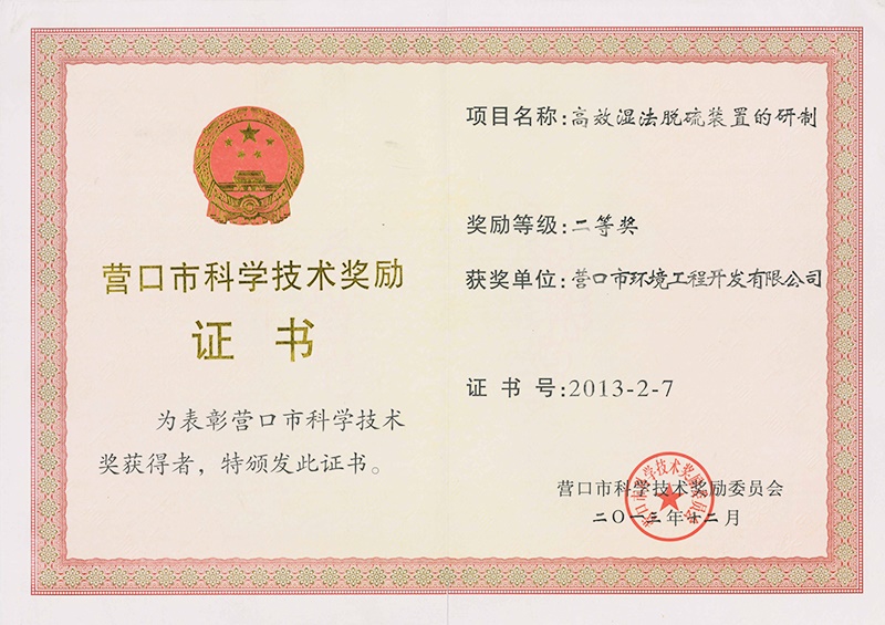 營(yíng)口市科學(xué)技術(shù)獎(jiǎng)勵(lì)證書(shū)